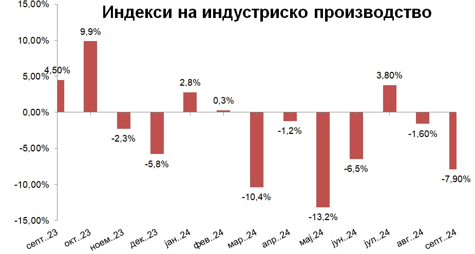 Податоците од Државниот завод за статистика покажуваат дека производството во секторот Рударство и вадење камен индустриското производство во септември годинава имало пад од 7,5%, во секторот Снабдување со енергија, гас има пад од 10%, додека производството во Преработувачката индустрија, каде се создава околу 80% од целото индустриско производство, има пад од 6,3% во септември годинава во споредба со истиот месец лани.
