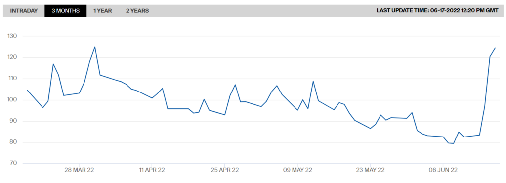 Цените на  продолжија да растат од остриот прекин на снабдувањето од Русија. Референтната цена на природниот гас во Европа, холандскиот TTF, вчера достигна речиси 150 евра (158 долари) за мегават/час пред да падне на 134 евра во попладневните часови денеска. Колку за споредба, во понеделникот на 13 јуни цените на фјучерсите на холандскиот TTF се тргуваа по 83 евра за мегават/час.