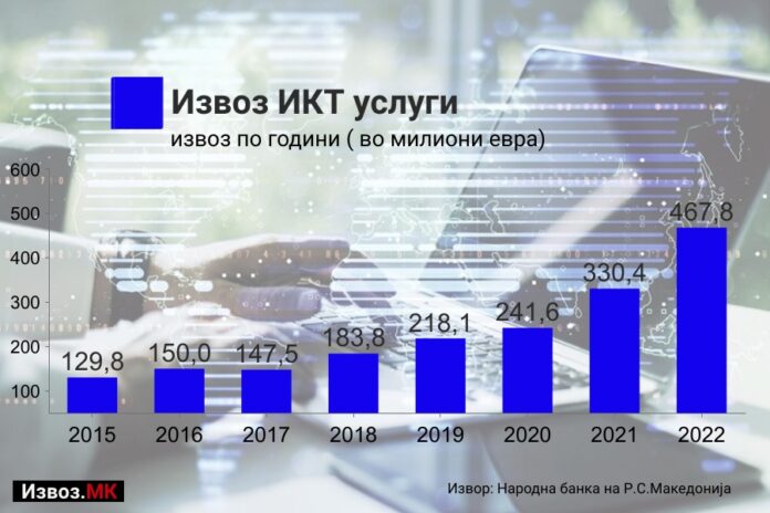 Извозот на ИКТ услуги во 2022 година надмина 467 милиони евра. Тоа е раст од 41% или зголемување за 137 милиони евра во споредба со извозот од претходната 2021 година кога извозот на ИКТ услуги изнесуваше 330 милиони евра.