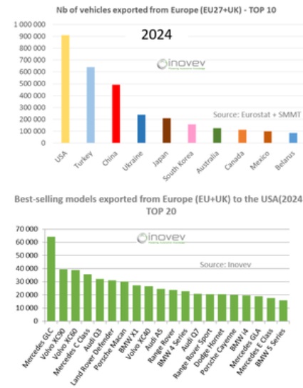 Според Иновев, групацијата VW учествува со 26% во извозот на европски автомобили во САД, додека Mercedes има 23%, BMW – 19%, Geely (Volvo) – 13% и Jaguar Land Rover 12%. Најпродаваните европски увозни автомобили во САД се Mercedes GLC со 60.000 единици, по што следуваат Volvo XC90 и XC60.