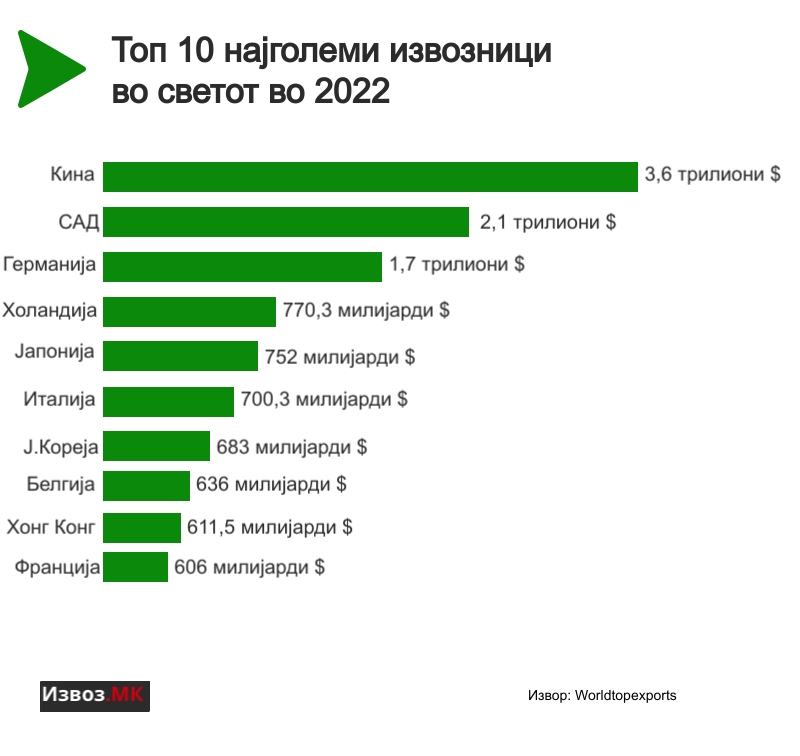 Овие 10 најголеми извозни земји оствариле 49,3% од вкупниот извоз минатата 2022 година.