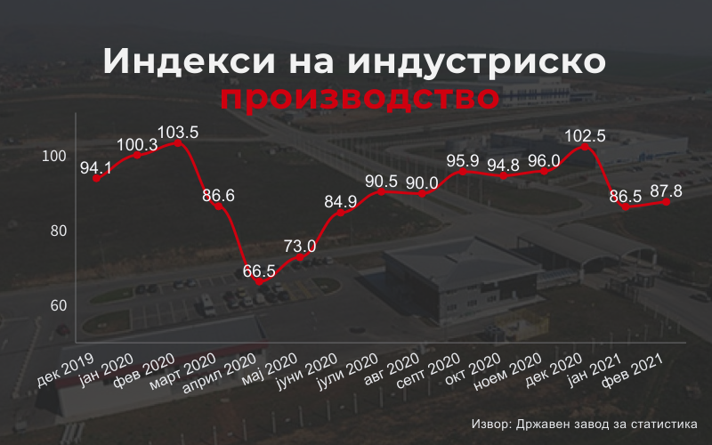 Македонската економија се уште силно ги чувствува негативните ефекти од пандемијата на корона вирусот, а најдобар показател за тоа е производството во индустријата, кое според статистичките податоци е се уште под нивото од пред да започне пандемијата.