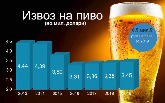 Македонските производители на пиво во текот на изминатата 2019 година извезле пиво во вредност од само 3,45 милиони долари. Извозот на пиво лани бележи раст од 1,9% во споредба со претходната 2018 година, но гледано наназад бележи континиран пад во изминатите неколку години.