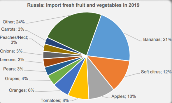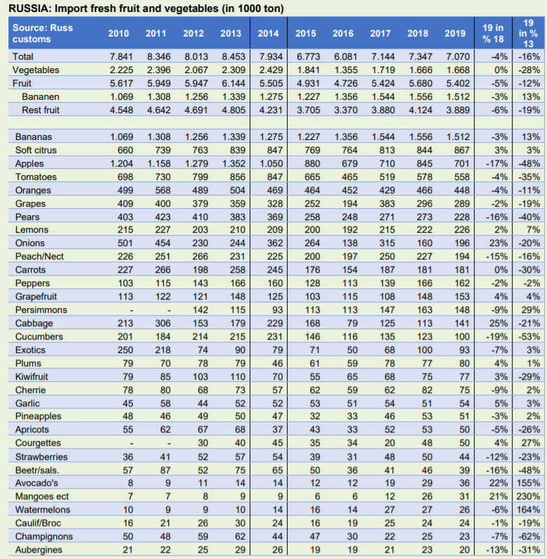 Во 2019 година во Русија биле увезени 7 милиони тони свеж зеленчук и овошје, што е за 4% или за 1,5 милиони тони помалку во споредба со 2018 година, а за 17% помалку во споредба со 2013 година. Увозот на свеж зеленчук остана на исто ниво како и во 2018 година, додека увозот на свежо овошје се намали за 5%.