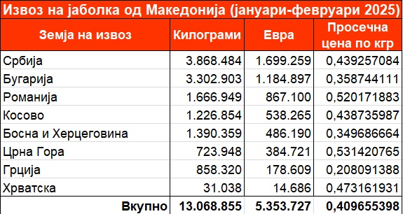 Во јануари и февруари, од Македонија биле извезени околу 13.000 тони јаболка, што е за 82% повеќе во споредба со истиот период минатата година. Вредноста на извозот, пак, се зголемил, и тоа за два и пол пати, од 2 на 5 милиони евра.