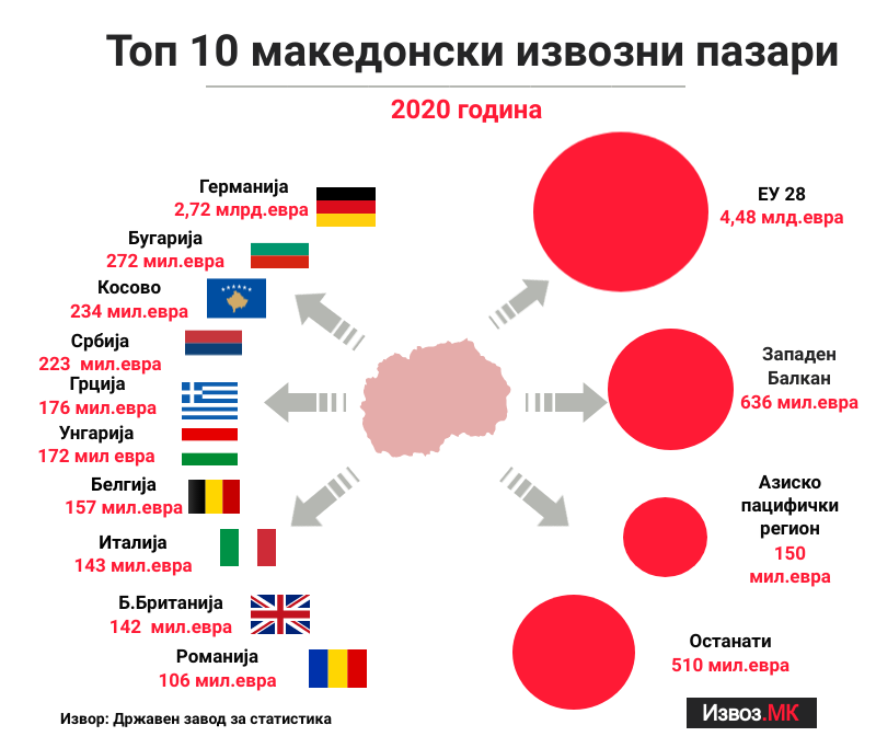 Најзначаен извозен пазар за македонската економија и минатата година беше Германија, каде во 2020 година се извезени производи во вредност од 2,7 милијарди евра или 47% од вкупниот извоз.