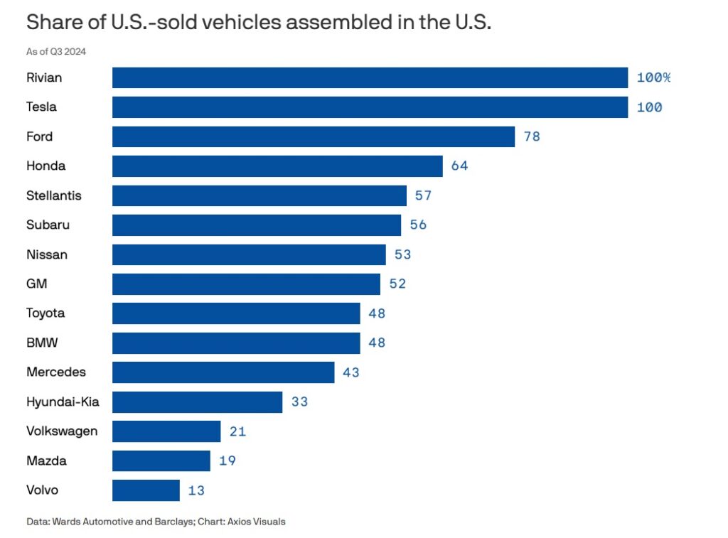 Според истражувањето на Wards Automotive и Barclays, Volvo (13%), Mazda (19%) и Volkswagen (21%) имаат најнизок удел од нивните продадени возила во САД во оваа земја. Hyundai-Kia (33%), Mercedes (43%), BMW (48%) и Toyota (48%), исто така, произведуваат помалку од половина од нивните возила продадени во САД овде.