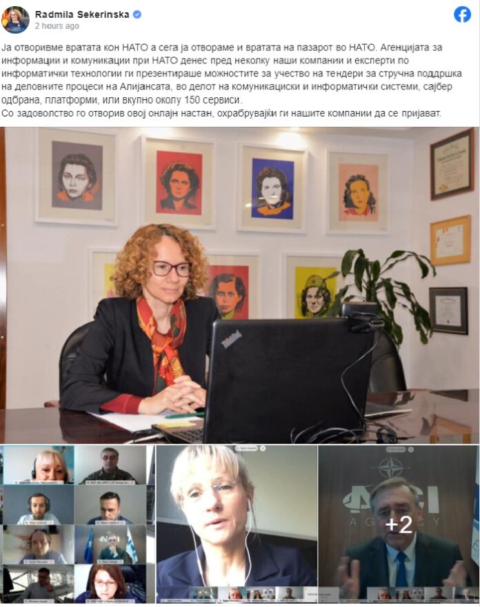 Агенцијата за информации и комуникации при НАТО денеска пред неколку наши компании и експерти по информатички технологии ги презентираше можностите за учество на тендери за стручна поддршка на деловните процеси на Алијансата, во делот на комуникациски и информатички системи, сајбер одбрана, платформи, или вкупно околу 150 сервиси, информира министерката за одбрана Радмила Шекеринска на својот фејсбук профил.