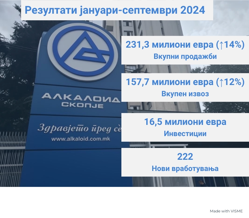 Најуспешната македонска компанија Алкалоид објави дека во периодот јануари-септември 2024 година успеала да ги зголеми продажбите и извозот, да инвестира во проширување и модернизација на производните капацитети и да ја зголеми профитабилноста и покрај бројните предизвици кои во работењето ги предизвикаа инфлацијата, високите каматни стапки и неизвесниот економски амбиент.