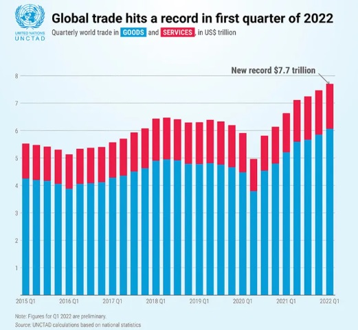 Вредноста на глобалната трговија се искачи на рекордни 7,7 трилиони долари во првиот квартал од 2022 година, што претставува зголемување од околу 1 трилиони долари во однос на првиот квартал од 2021 година, покажува најновиот извештајот Global Trade Update на УНКТАД .