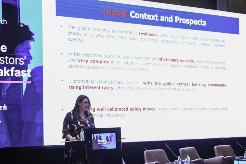 Инфлацијата е стабилизирана, додека централните банки внимателно ја нормализираат својата монетарна политика. Основните каматни стапки иако се намалуваат, сеуште се на повисоко ниво. Се очекува големите централни банки (Европската централна банка и Федералните резерви) да продолжат со олабавување на своите монетарни политики и во текот на 2025 година. Притоа, суштинска ќе биде координацијата помеѓу монетарната и фискалната политика, односно поддршката во понатамошното закотвување на инфлацијата преку фискалната консолидација, посочи вицегувернерката на Народната банка, Ана Митреска во своето обраќање на единаесетото издание на конференцијата „Ерсте инвесторс брекфаст“, којашто традиционално ја организираат „Ерсте банка“ и „Шпаркасе банка“.