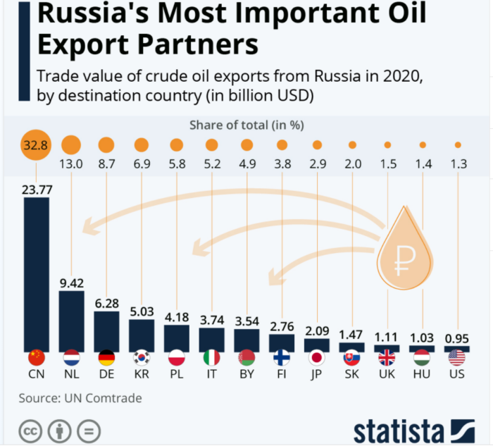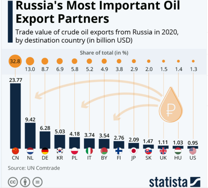 Извозот на нафта учествува со 44% во вкупните приходи од извоз на Русија. Според податоците од Comtrade, Кина е далеку најголемиот купувач на руската сурова нафта со учество од 32,8% во вкупниот извоз, покажува графиконот на Statista.