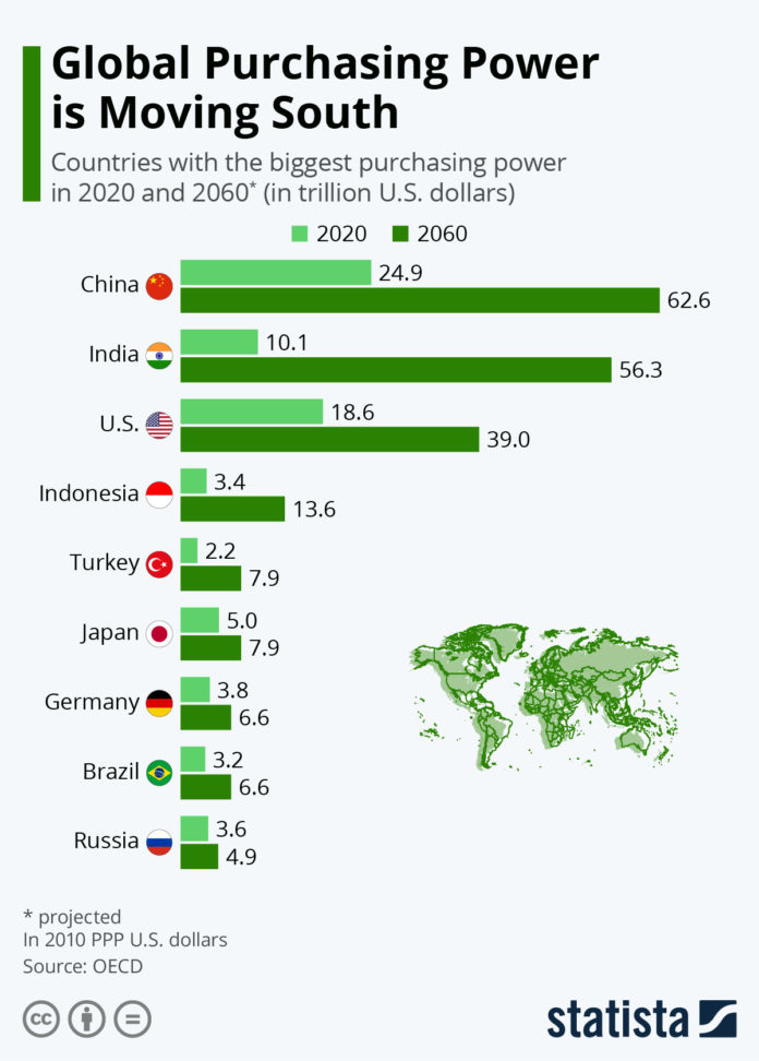 До 2060 година се очекува Индија да се искачи третото на второто место и да ја зголеми својата куповна моќ повеќе од пет пати отколку во 2020 година.