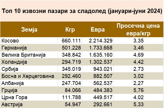 Најголем дел од македонскиот сладолед во првата половина годинава се продавал во Косово, Германија и Велика Британија. Следат Холандија, Србија, Босна и Херцеговина, Албанија, Грција, Црна Гора и Австрија.
