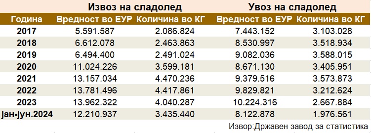 Ако се анализираат податоците за извозот и увозот на сладолед во изминатите години, може да се види дека Македонија во пандемиската 2020 година за прв пат имала поголем извоз ( 11 милиони евра) од увоз на сладолед (8,7 милиони евра). И тоа е така веќе четврта година по ред.