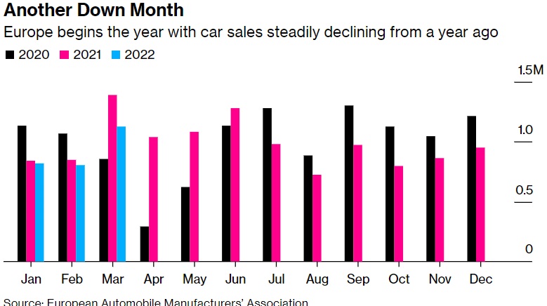 Продажбата на нови автомобили во Европа бележи намалување во март, деветти месец по ред, бидејќи растечките проблеми со синџирот на снабдување заради војната во Украина, продолжија силно да го погодуваат автомобилскиот сектор во регионот, покажуваат најновите податоци на Асоцијацијата на производители на автомобили во регионот ACEA.