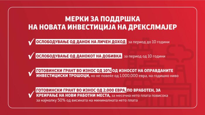 „Компанијата ќе добие поддршка во форма на ослободување од данок на личен доход за новите вработувања во компанијата, односно за оние кои ќе бидат дел од овој проект, за период до 10 години, како и ослободување од данокот на добивка кој се однесува на новиот инвестицискиот проект, за период од 10 години. Исто така ќе се изврши исплата кон Дрекслмајер во форма на готовински грант во износ од 10% од износот на оправданите инвестициски трошоци, но не повеќе од 1.000.000 евра, на годишно ниво, за максимум пет години, како и исплата  форма на готовински грант во износ од 2.000 (две илјади) евра, по вработен, за креирање на нови работни места, а особено е важно што оваа поддршка се однесува за оние работни места, за кои континуирано се исплаќа месечна нето плата повисока за најмалку 50% од висината на минималната нето плата пропишана со Законот за минимална плата на Република Северна Македонија“, потенцираше вицепремиерот.