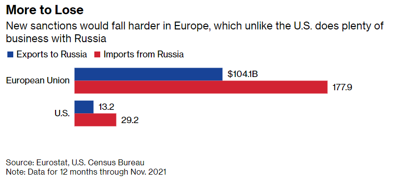 Европската унија има многу што повеќе да изгуби од САД во случај на евентуален конфликт со Русија, бидејќи европската економија е далеу поизложена на Русија од амертиканската. Тоа е едно од објаснувањата зошто зошто западните сојузници имаат тешкотии да се договорат за цврст став околу Украина, пишува Bloomberg.
