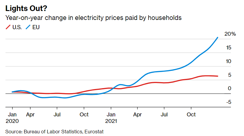 Гасот е особено чувствителна работа сега, бидејќи Русија го задржува снабдувањето во последните неколку месеци. Цените се тројно зголемени, зголемувајќи ја цената на електричната енергија низ целиот континент. Тоа е главната причина што Европа претрпува поголем енергетски шок од САД.