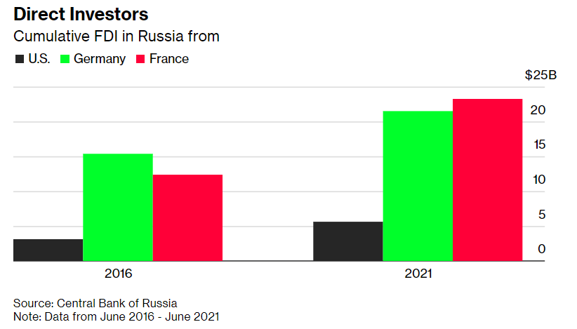 Русија е рангирана како петти најголем трговски партнер на ЕУ, како и нејзин главен снабдувач со енергија, додека за САД, Русија едвај влегува во првите 30 најголеми трговски партнерти. Има сличен јаз за инвестиции, при што Русија црпи пари од европските познати имиња, вклучително и Икеа , Royal Dutch Shell Plc и Volkswagen AG.