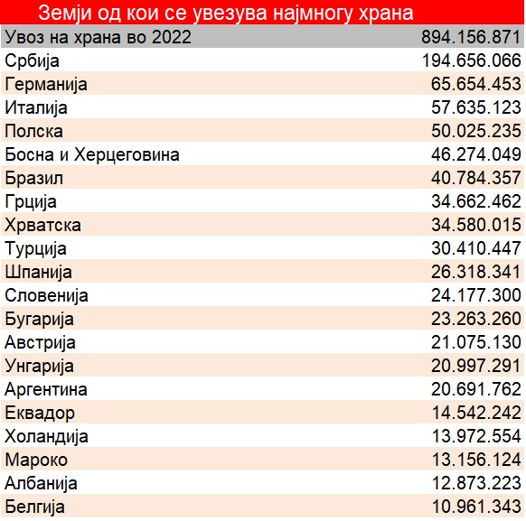 Податоците за увозот според земји покажуваат дека Србија е најголем пазар за увоз на храна лани била Србија. Од северниот сосед лани сме увезле храна во вредност од 194 милиони евра, што е 22% од целиот увоз на храна.