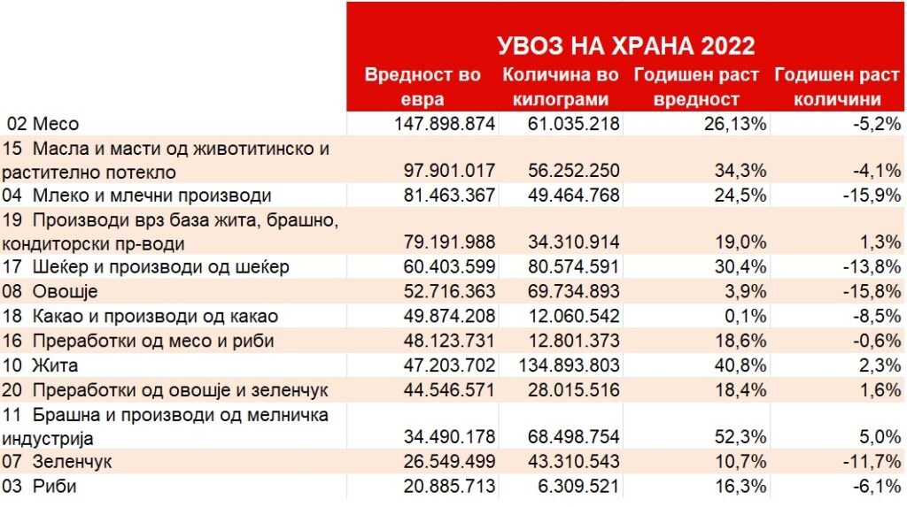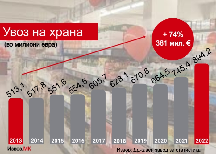 Податоците од Државниот завод за статистика покажуваат во текот на изминатата 2022 година сме увезле храна во рекордно најголема вредност од 894 милиони евра. Тоа е зголемување за 20% или за 148 милиони евра во споредба со вредноста на увезената храна претходната 2021 година.