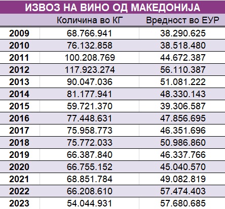Извозот на вино бележи постојан раст во последните 15 години. Во 2023 година биле извезени македонски вина во вредност од 57,7 милиони евра, што е зголемување од 50% во споредба со извозот на вино пред 15 години кој изнесувал 38 милиони евра.