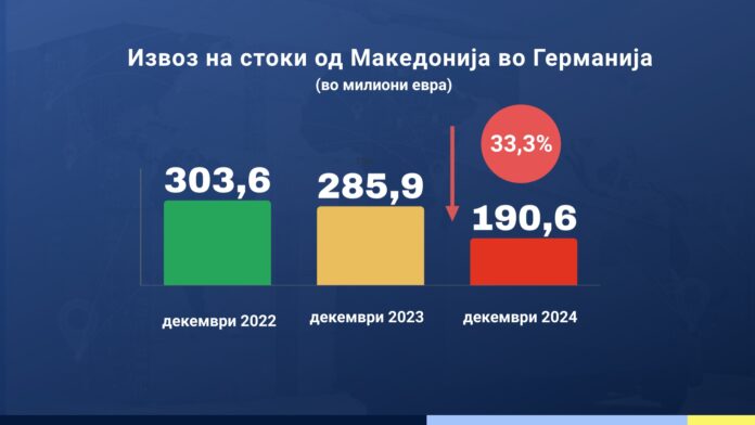 За целата 2024 година извозот во Германија изнесувал 3 милијарди евра и е помал за 600 милиони евра во споредба со претходната 2023 година, што е пад од 15,5%.