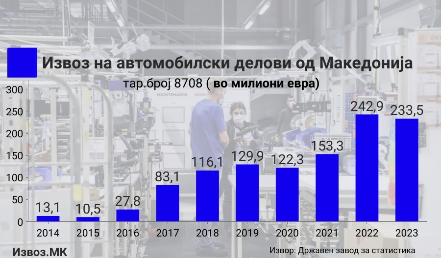 Пред 10 години, односно во 2014 година извозот на автомобилски делови од земјава изнесувал само 13 милиони евра, што е зголемување за 18 пати во споредба со извозот во 2023 година.