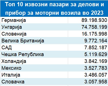 Статистичките податоци покажуваат дека околу 40% од извозот на делови минатата 2023 година или 89,1 милион евра бил насочен кон Германија.