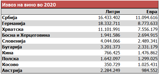 Податоците од Државниот завод за статистика покажуваат дека најголеми извозни пазари за македонските вина минатата година биле Србија каде минатата година бил направен извоз вреден 11 милиони евра. Следат Германија со извоз вреден 8,7 милиони евра, Хрватска со извоз од 7,5 милиони евра, БиХ со извоз од 2,7 милиони евра и Словенија со извоз од 2,5 милиони евра.