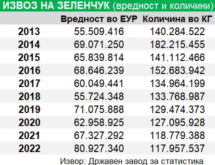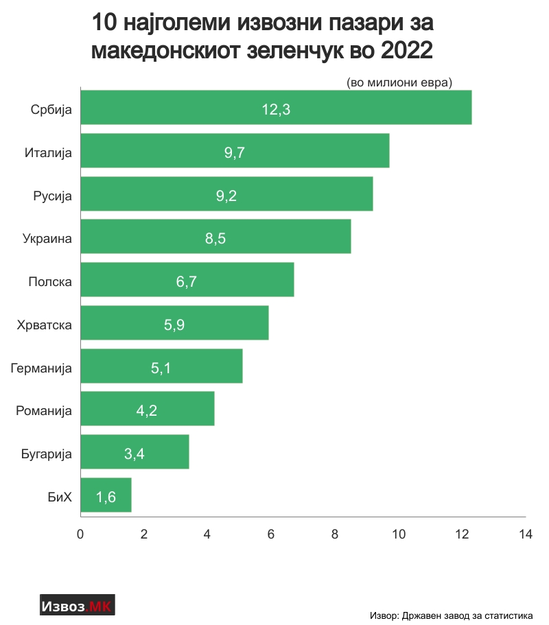 Ако се анализираат податоците за вредноста на извозот, најголем извозен пазар за македонскиот зеленчук минатата 2022 година била Србија. Во Србија лани биле продадени 17,6 илјади тони зеленчук во вредност од 12,3 милиони евра.