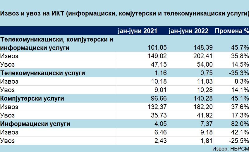 Извозот на Информациски, компјутерски и телекомуникациски (ИКТ) услуги од Македонија во првата половина од 2022 година надмина 202,4 милиони евра, што претставува раст од 35,8% во споредба со истиот период од 2021 година, покажуваат податоците од Народната банка на Р.С.Македонија.