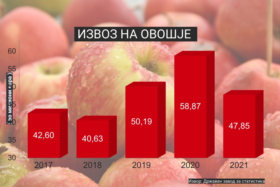Изминатата 2021 година била лоша за македонските извозници на овошје. Податоците од Државниот завод за статистика покажуваат дека во текот на изминатата 2021 година од Македонија било извезено овошје во вредност од 47,85 милиони евра, што е за 11 милиони евра помалку во споредба со претходната 2020 година. Тоа е годишен пад на вредноста на извозот на овошје од 18,7%, но кај клучните извозни производи како на пример, јаболката и праската, тој пад е многу поголем.