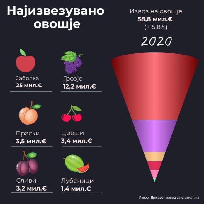 Податоците од Државниот завод за статистика покажуваат дека извозот на овошје од Македонија минатата година достигна 58,8 милиони евра, што е раст од 15,08% или за 7,7 милиони повеќе во споредба со извозот остварен во претходната 2019 година.