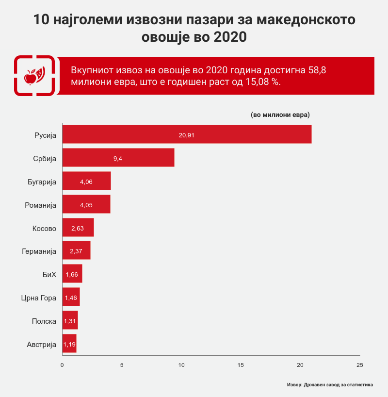 Втор најголем извозен пазар е Србија, каде минатата 2020 година бил реализиран извоз на овошје во вредност од 9,4 милиони евра, односно 26,2 илјади тони. Тоа е вредносно раст на извозот од 27,7%,