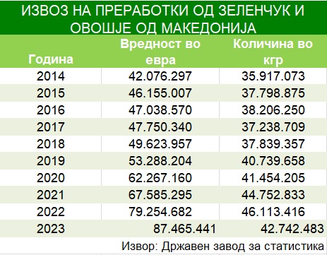 Според податоците на Државниот завод за статистика во изминатата 2023 година од Македонија биле извезени преработки од зеленчук и овошје во вредност од 87,5 милиони евра, што е раст 10,4% или за осум милиони евра повеќе во споредба со 2022 година.