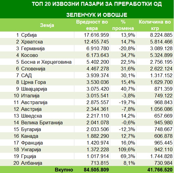Гледано по земји, македонските преработки од зеленчук и овошје традиционално најдобро се продаваат во земјите од регионот. Во 2023 година најголем извозен пазар била Србија. Извозот кај нашиот северен сосед минатата година изнесувал 17,6 милиони евра.