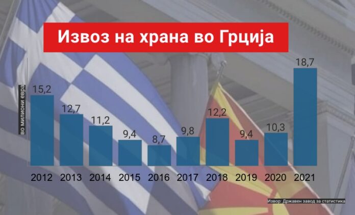 Во однос на претпандемиската 2019 година, кога извозот на храна во Грција изнесувал 9,4 милиони евра, продажбите на грчкиот пазар минатата година се зголемени речиси двојно.
