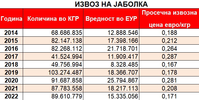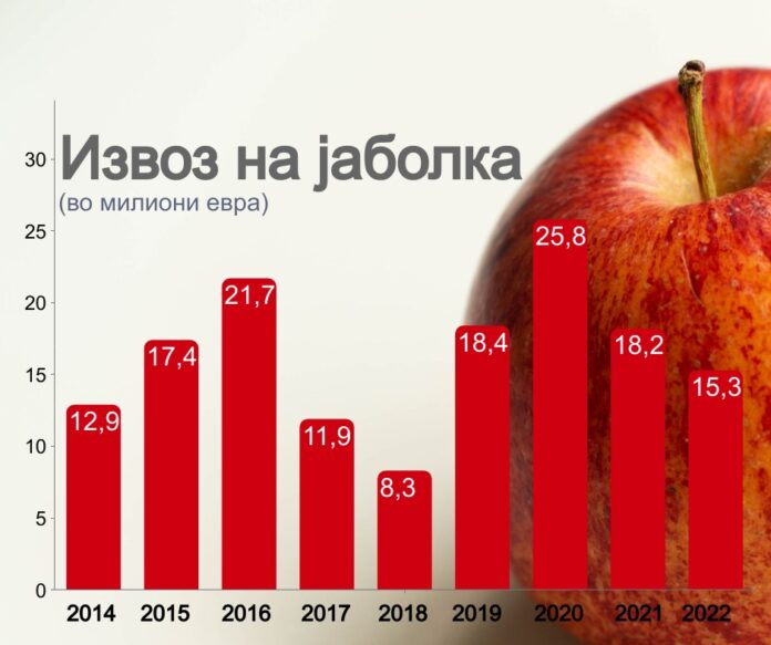 Минатата 2022 година од Македонија биле извезени јаболка во вредност од 15,2 милиони евра, што е намалување од 15,8% во споредба со претходната 2021 година кога во странство се продале јаболки во вредност од 18,2 милиони евра.