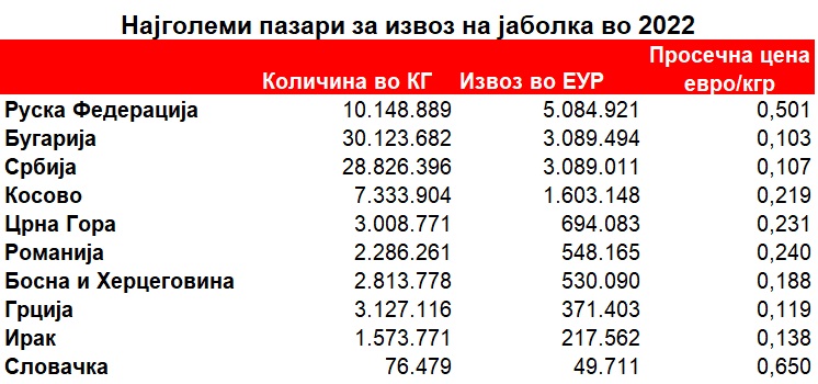 Бугарија е втор најголем извозен пазар за јаболка според вредноста, а прв најголем според извезената количина јаболка за минатата 2022 година. Во Бугарија лани биле извезени 30 илјади тони јаболка во вредност од 3 милиони евра. Или просечната извозна цена на бугарскиот пазар била само 0,1 цент по килограм јаболка.