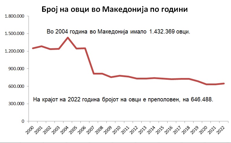 Податоците од Државниот завод за статистика покажуваат и големо намалување на бројот на овци во Земјава. Во 2000 година бројот на овци изнесувал 1.250.686. Во 2022 година бројот на овци е преполовен и изнесувал 646.488. Во последните 23 години, најголем број на овци имало во 2004 година 1.432.369.