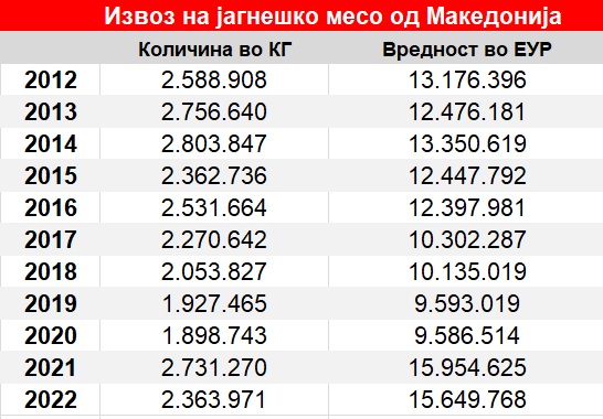 Податоците од Државниот завод за статистика покажуваат дека лани и 2021 година имало поголем извоз на јагнешко, барем вредносно со извоз од над 15,5 милиони евра. Највисока просечна извозна цена имало во 2022 година од 6,62 евра по килограм.