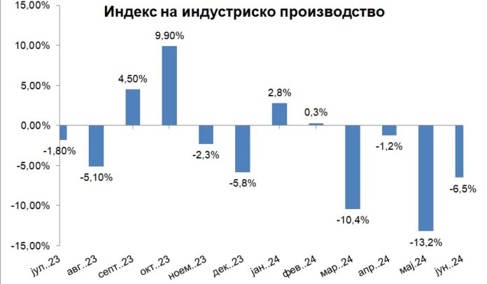 За периодот од јануари до јуни 2024 година индустриското производство бележи пад од 5,1%.