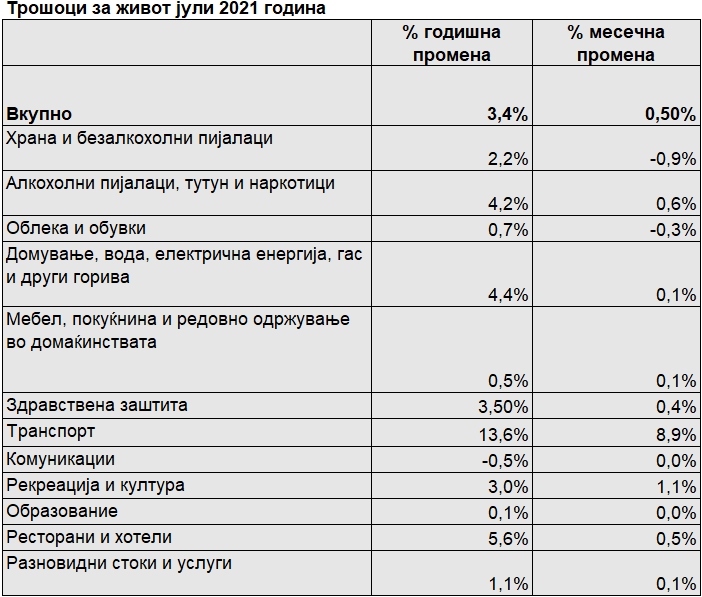 Индексот на трошоците на животот во јули 2021 година, во однос на јули 2020 година, бележи зголемување од 3,4 %, а индексот на цените на мало бележи зголемување од 5,4 %, покажуваат најновите податоци од Државниот завод за статистика.