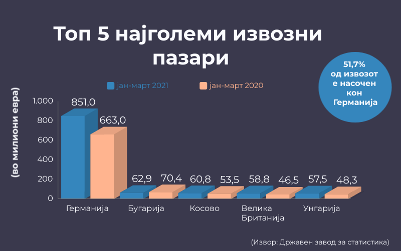 Податоците покажуваат дека извозот во Германија во првите три месеци бележи раст од 28% во споредба со првите три месеци од 2020 година или е поголем за 187 милиони евра.