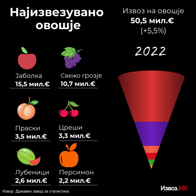 Изминатата 2022 година била од Македонија било извезено овошје во вредност од 50,5 милиони евра, што е зголемување за 5,5% во однос на вредноста на извезеното овошје во 2021 година. Што се однесува до извезените количини тие се поголеми за 3,3% во однос на претходната 2021 година, односно во текот на 2022 година на странските пазари било извезено околу 140 илјади тони овошје.