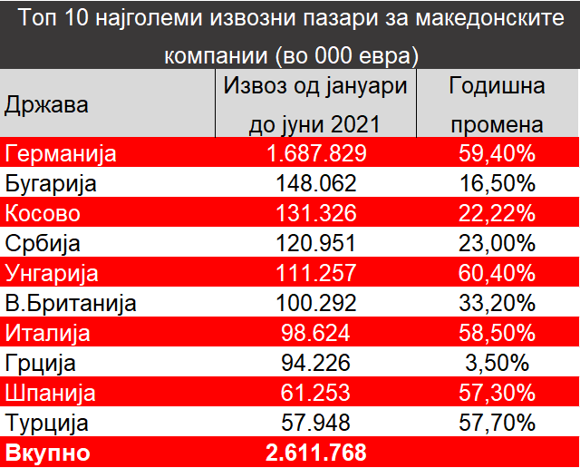 Податоците покажуваат дека извозот во Германија во првите шест месеци бележи раст од 59,4% во споредба со истиот период 2020 година, или е поголем за 629 милион евра. Лани, на почетокот на пандемијата, токму извозот во Германија имаше најголем пад заради затворањата во германската индустрија предзивикани од коронакризата.
