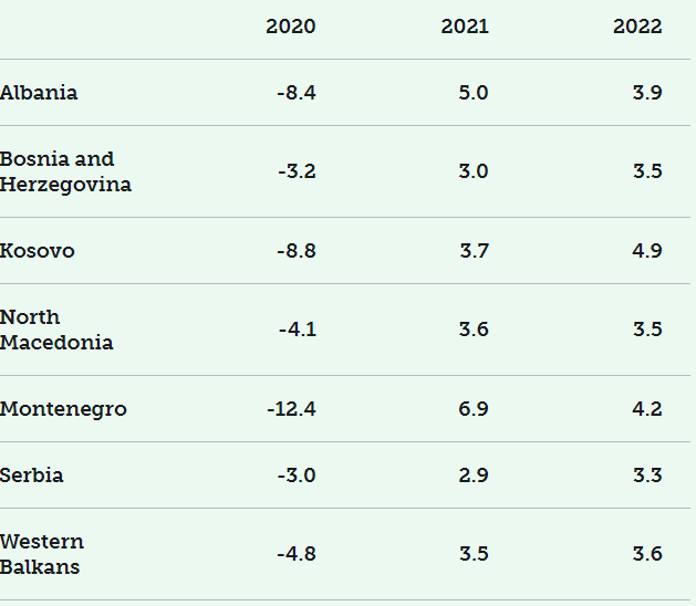 Според проценките на Светската банка, најголем пад на БДП годинава од земјите во регионот, ќе имаат Црна Гора од дури 12,4%, Косово со пад од 8,8% и Албанија со пад од 8,4%, додека најмал пад од само 3% ќе има Србија.