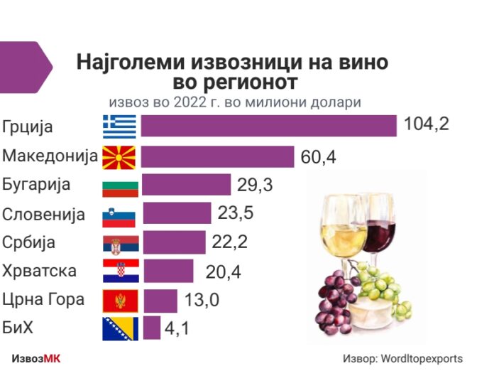 Во регионот, пак, Македонија е еден од лидерите и според вредноста на извезеното вино, но и според производството на вино. Според остварениот девизен прилив од извозот на вино, Македонија се рангира втора во регионот после Грција, која лани била 25-ти најголем извозник во светот со извоз на вино вреден 104 милиони долари.